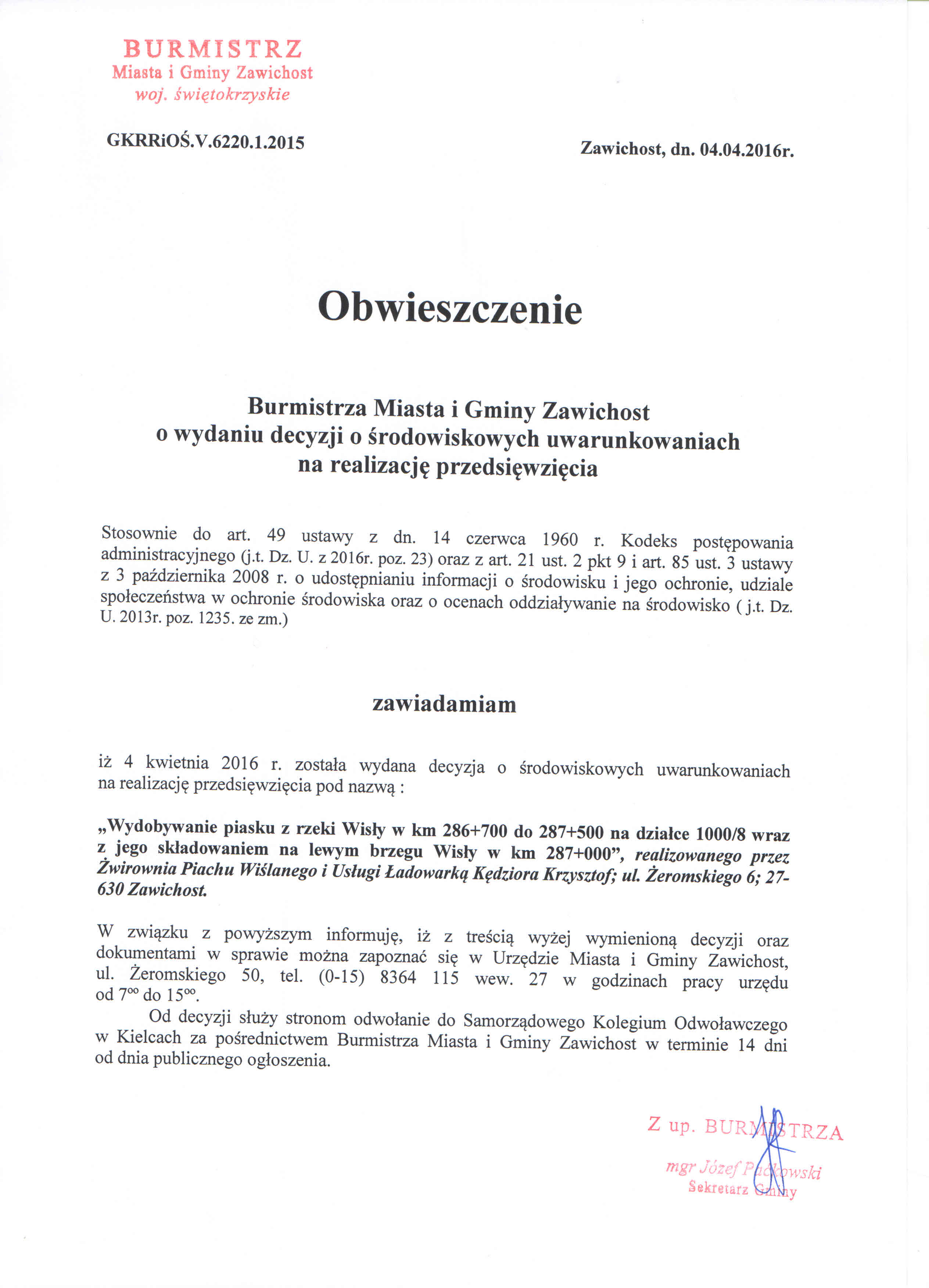 | OBWIESZCZENIE Burmistrza Miasta i Gminy Zawichost |