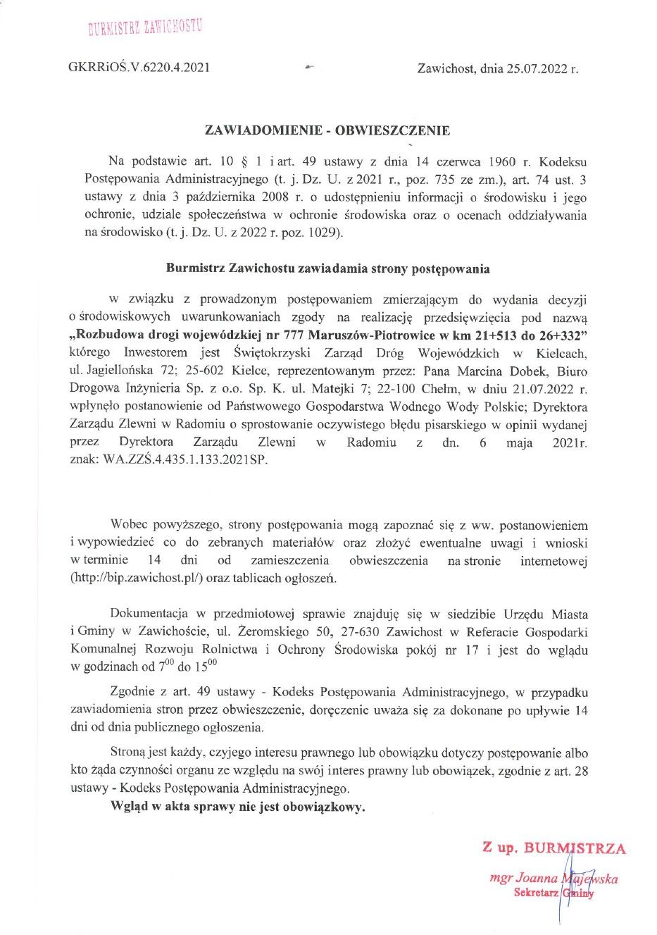 Na podstawie art. 10 § 1 ustawy z dnia 14 czerwca 1960r. Kodeksu postępowania administracyjnego ( t.j. Dz. U. z 2013r., poz. 260 ze zm.) oraz art. 53 ust. 1 ustawy z dnia 27 marca 2003r. o planowaniu i zagospodarowaniu przestrzennym ( t.j. Dz. U. z 2012r., poz. 647 ze zm.), Burmistrz Miasta i Gminy Zawichost zawiadamia strony postępowania, że na wniosek złożony w dniu 22.09.2015 r. przez Orange Polska S.A., Al. Jerozolimskie 160, 02-326 Warszawa, Okręg Katowice w imieniu której wystąpił pełnomocnik Pan Piotr Janik, NetWorkS! Sp. z o.o. Biuro Regionalne Katowice, ul. Sowińskiego 46A, 40-018 Katowice, jest prowadzone postępowanie w sprawie wydania decyzji o ustaleniu lokalizacji inwestycji celu publicznego o znaczeniu gminnym dla zamierzenia inwestycyjnego polegającego na: budowie stacji bazowej telefonii komórkowej nr 24060 KTB_ZAWICHOST_MARUSZOW wraz z drogą dojazdową i przyłączem energetycznym na działce o nr ewid. 30/2 położonej w miejscowości Linów, gmina Zawichost. Zgodnie z art. 53 ust. 4 pkt 6 ustawy o planowaniu i zagospodarowaniu przestrzennym oraz art. 106 § 1 ustawy Kodeksu postępowania administracyjnego, Burmistrz Miasta i Gminy Zawichost pismem z dnia 02.10.2015r znak GKRRiOŚ.i.6733.3P.2015r wystąpił do Starostwa Powiatowego w Sandomierzu, ul. Mickiewicza 34, 27-600 Sandomierz, i Świętokrzyskiego Zarządu Melioracji i Urządzeń Wodnych w Kielcach Rejonowy Oddział w Sandomierzu ul. Staromiejska 14, 27-600 Sandomierz oraz Generalnej Dyrekcji Dróg Krajowych i Autostrad w Kielcach ul. Paderewskiego 43/45, 25-950 Kielce o uzgodnienie projektu decyzji o ustaleniu lokalizacji inwestycji celu publicznego dla w/w inwestycji.