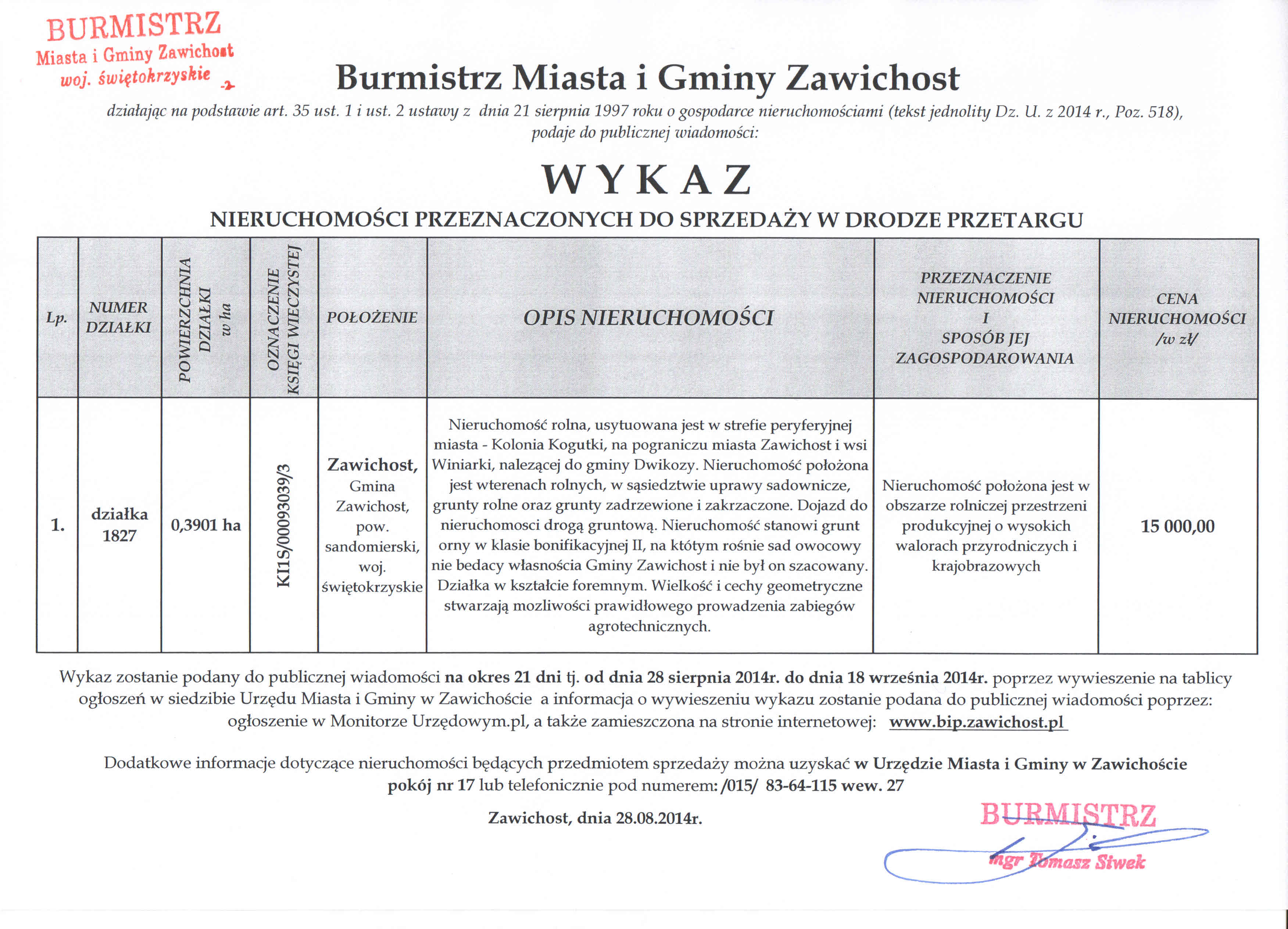 | Burmistrz Miasta i Gminy Zawichost podaje do publicznej wiadomości:wykaz nieruchomości przeznaczonych do sprzedaży w drodze przetargu |